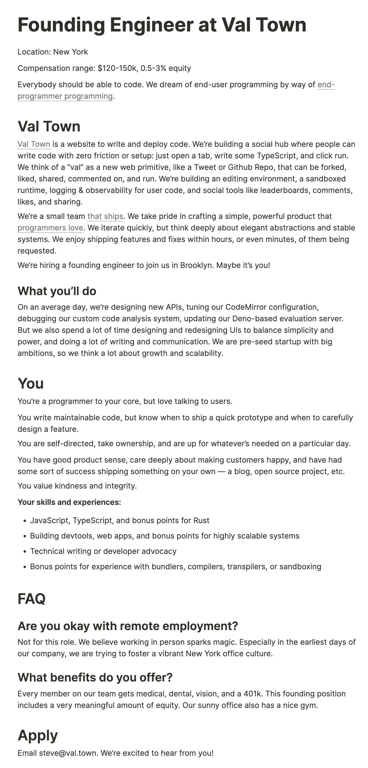 As of fall 2023 (I’m writing this on October 27th), my ideal next next job is founding engineer at Val Town. Here’s a screenshot, in case they take it down: